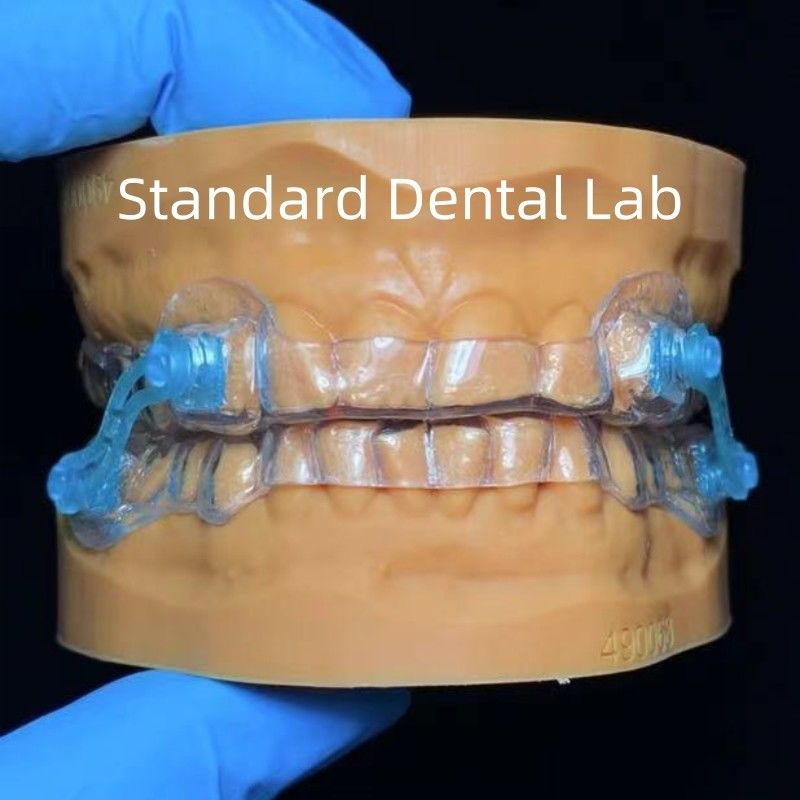 Uczniowie często odczuwają ulgę przy użyciu ustników zaprojektowanych w celu zmniejszenia chrapania.do usta i popchnąć dolną szczękę do przodu, aby otworzyć drogi oddechoweUrządzenia zatrzymujące język (TRD) chwytają język i zapobiegają jego wpadnięciu do tylnej części gardła, co często powoduje chrapanie u osób śpiących z tyłu.To, co dostarczyła VIVI Dental Lab, to pierwsze MAD..